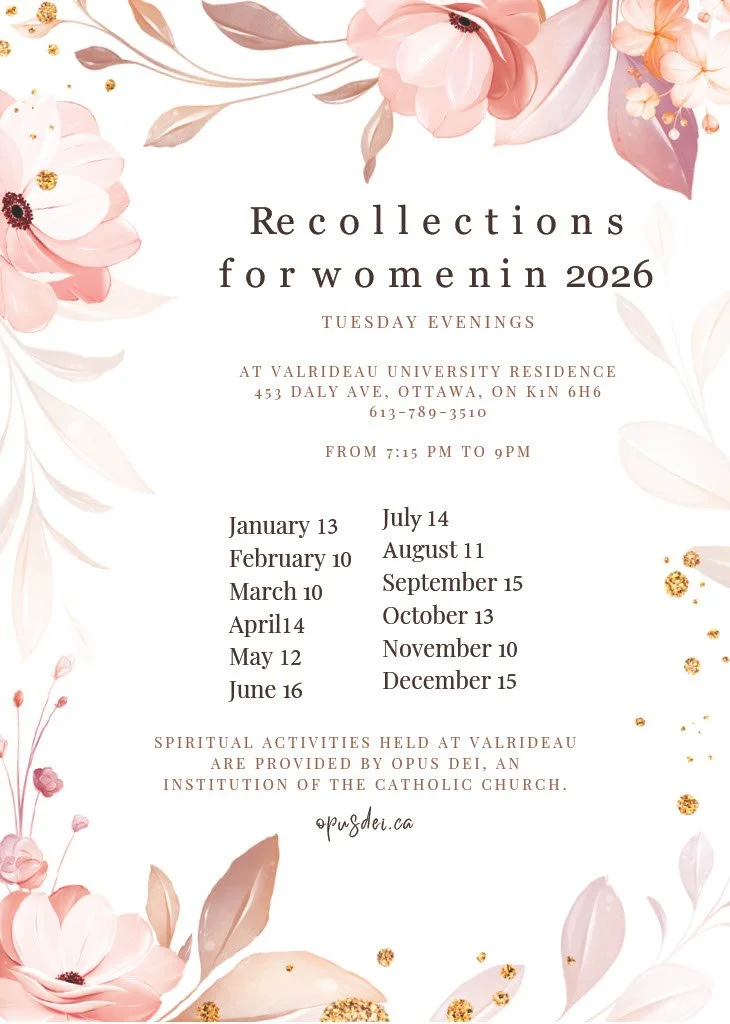 Recollections, mini-retreats, are a monthly opportunity to re-examine one's life goals and refresh one's spirit. The program includes a meditation given by an Opus Dei priest, free time for meditation and prayer and a short talk. The priest is also available for confession.