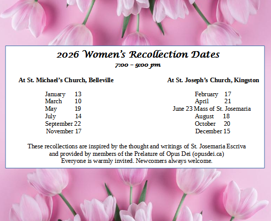 Belleville/Kingston - Recollections take place in the evening at St. Michael’s Catholic Church, Belleville, or at St Joseph’s Catholic Church, Kingston, from 7 to 9 pm, dates according to the schedule below.